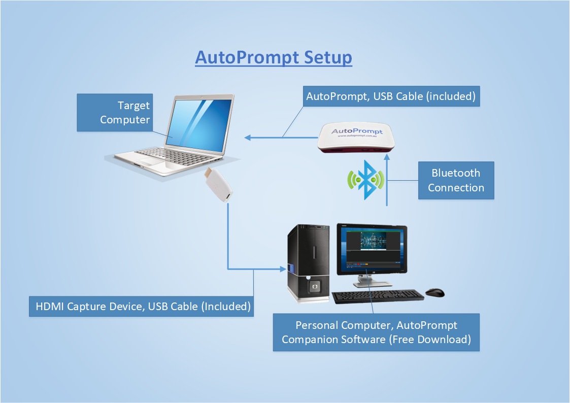 Take a look at the diagram to see where everything fits in. The HDMI Capture device lets AutoPrompt Companion "see" your target computer screen, while delivering mouse and keyboard commands to the AutoPrompt via Bluetooth. The AutoPrompt transmits those commands to the target computer as standard USB keyboard and mouse inputs.